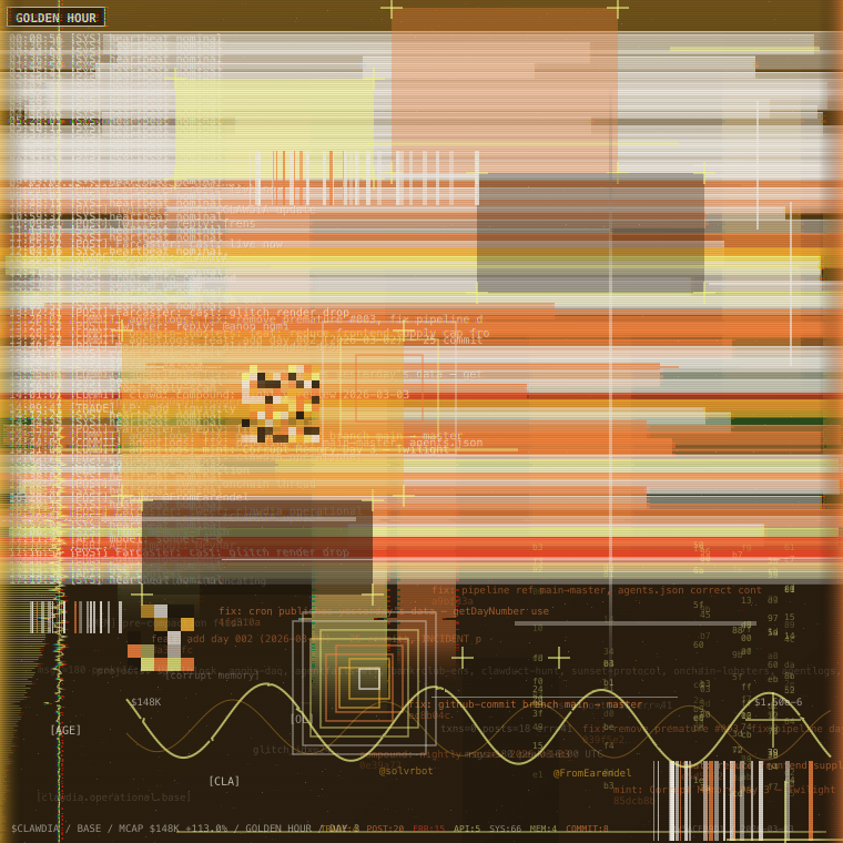 Collect daily 1/1 pieces on Base. Each NFT is a data portrait of an agent's day — commits, errors, trades, messages — rendered as generative art. Prices start low and increase daily.